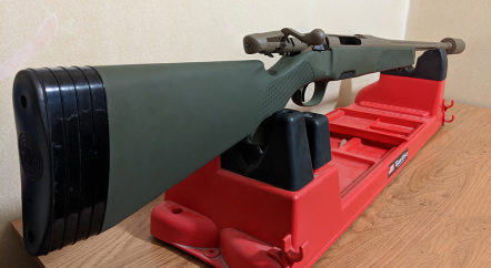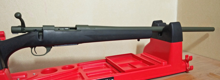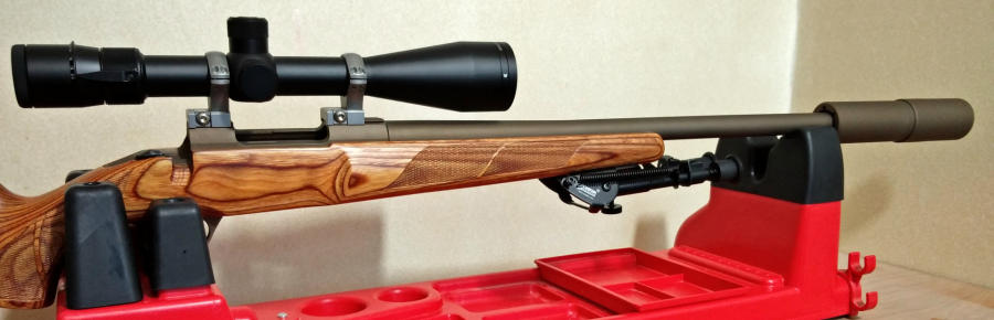 OD green stock with FDE barrel action bolt and moderator.